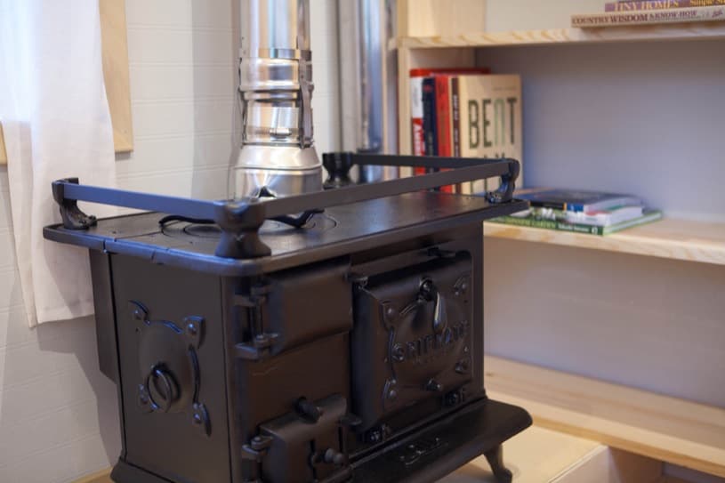 En su interior, lo primero que llama la atención es la disposición en diagonal de los tablones que forman el suelo de madera. Hay una estufa que está apoyada sobre una plataforma que oculta parte de las ruedas del remolque. Ésta es la primera vez que vemos una casa móvil con esta disposición, tal vez producto de una mala planificación a la hora de construirla.