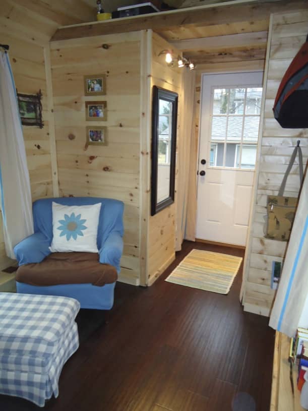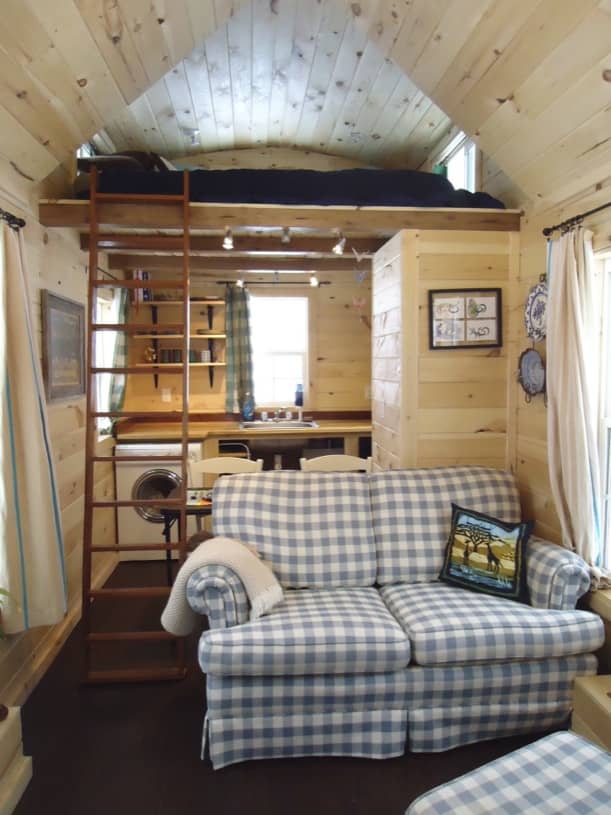 Keep On The Sunny Side tiene un pequeño porche en la puerta de acceso, situada en el extremo frontal. En total, esta casita tiene 11 ventanas, lo que favorece bastante su ventilación y la entrada de luz natural. Una vez dentro, vemos que a un lado está el baño, y al otro un armario para guardar la ropa. El resto está ocupado por la sala, que está amueblada con un sillón, y un sofá de dos plazas. Al fondo se ha dejado el espacio destinado para cocinar. Justo encima de la cocina está el típico altillo para dormir, accesible mediante una escalerilla.
