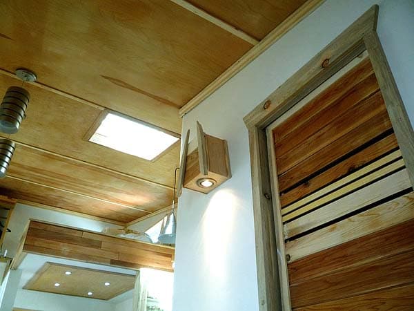 El interior de esta version.2 se ha dejado parcialmente con acabado de yeso (en blanco). Por ese motivo el espacio se ve más luminoso y grande que si hubiera sido revestido en su totalidad con madera.
