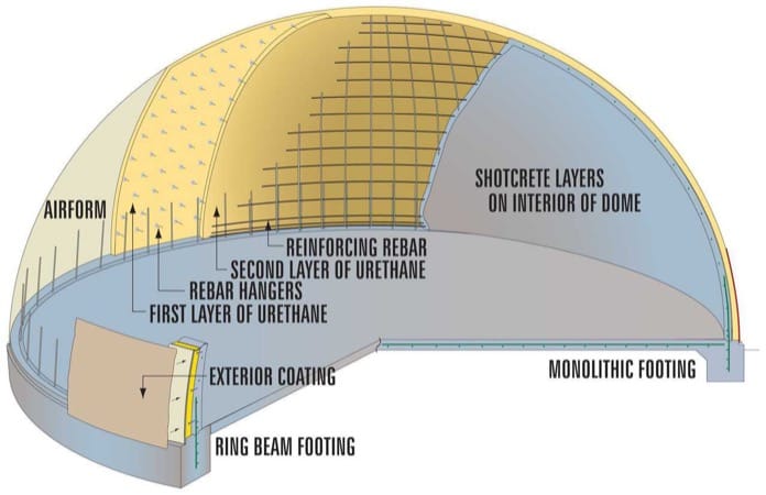 Las estructuras Monolithic Cabin se construyen a partir de una losa de hormigón armado sobre la que se infla una estructura hinchable que hará de molde (airform). Luego se vierte una primera capa interior de espuma de poliuretano (de 7.5cms de espesor), que servirá de base para las armaduras de acero de la estructura (formando una malla). Este mallado se coloca encima de una segunda capa de aislante. El proceso se completa con una mezcla de hormigón, que se proyecta sobre la superficie interior de la cúpula.