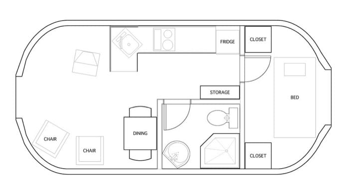 La planta y fotos del interior se corresponden a un modelo de 24 pies de longitud, y 24m2 de superficie útil. En su versión estándar se incluye el mobiliario, y cuesta unos $34.248 (27.809€).