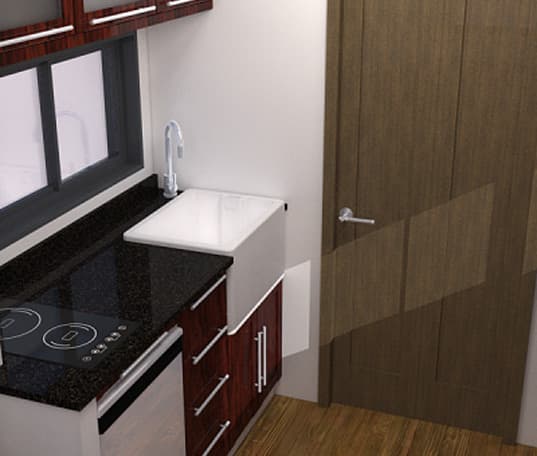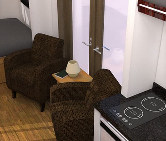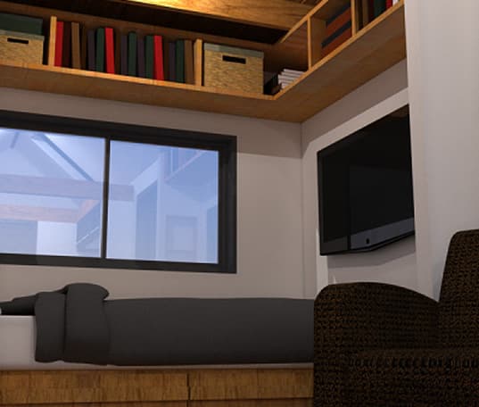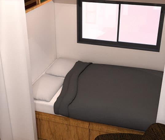 El modelo BRV1 tiene una superficie de 2.34 x 6.40 metros (15m2). Se distribuye de tal manera que hay sitio para un cuarto de baño, dormitorio, sala-comedor, y cocina. Sí, has leído bien, esta pequeña vivienda tiene cama en el nivel inferior. Pero cuenta también con altillo encima del dormitorio, y otro más reducido sobre el aseo, para utilizar como espacio de almacenaje. Contrariamente a lo que estamos acostumbrados a ver en viviendas mínimas, este diseño tiene la entrada en uno de sus laterales. Se han incluido además dos tragaluces, y numerosas ventanas en fachada. El resto de detalles, se pueden apreciar en los renders que acompañan a este post.