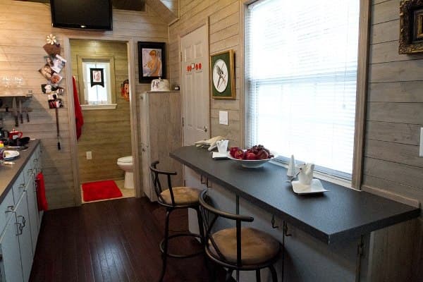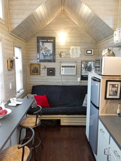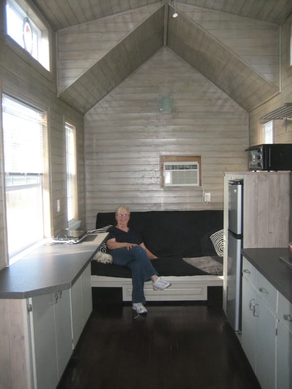 Para quienes estén acostumbrados a ver este tipo de casas diminutas, seguro que este modelo les parecerá diferente. Se nota que el interior está pensado para alguien de cierta edad, porque el espacio para dormir no está en un altillo, sino en un sofá-cama situado al fondo. A la madre de Dan le gusta cocinar, de ahí el protagonismo de la cocina, que ocupa casi todo el lateral de la casa. En el extremo opuesto está el cuarto de baño (con ducha).