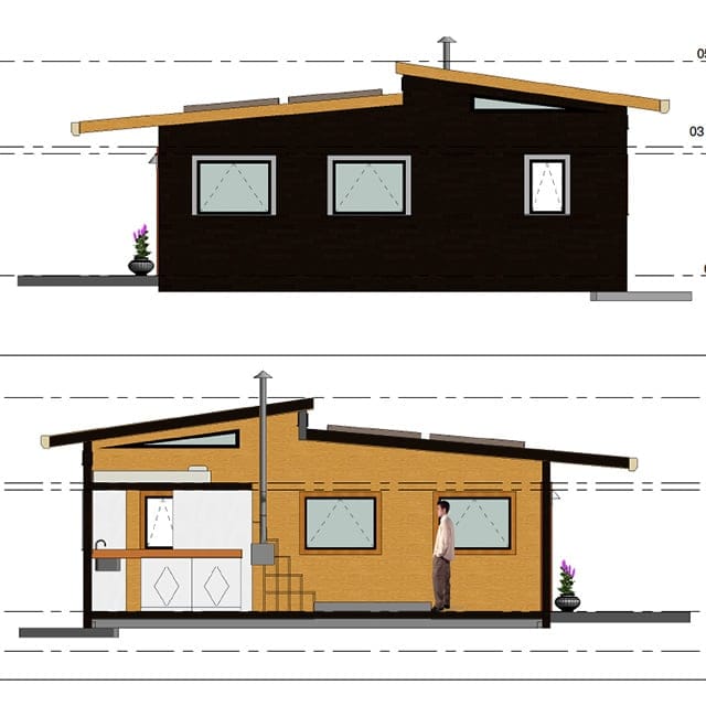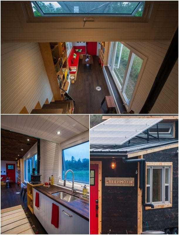 Greenmoxie es una de las tiny houses menos diminutas que hayamos visto, pues alcanza una superficie de 31,5m2. Su fachada está revestida de madera de cedro quemada, empleando la técnica shou-sugi-ban. Los suelos son de roble, el techo es de madera recuperada de un granero, al igual que las ventanas. Dentro hay una sala, cocina, y cuarto de baño al fondo. Una escalera hecha de estantes sirve de acceso al loft, lugar donde está el dormitorio. La cubierta posee una forma quebrada, lo que permite una ventana horizontal en el altillo, para facilitar su ventilación.