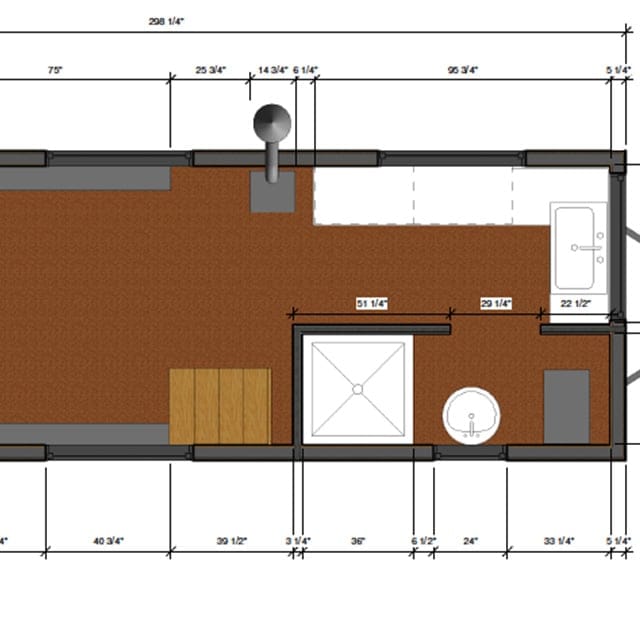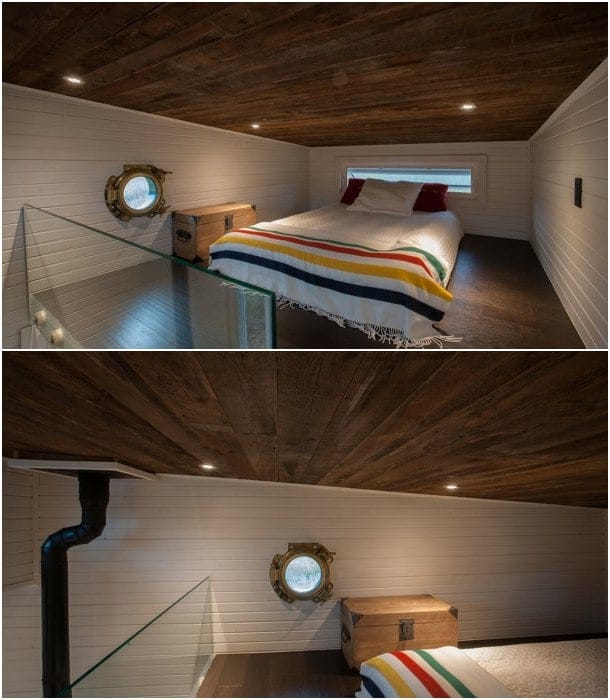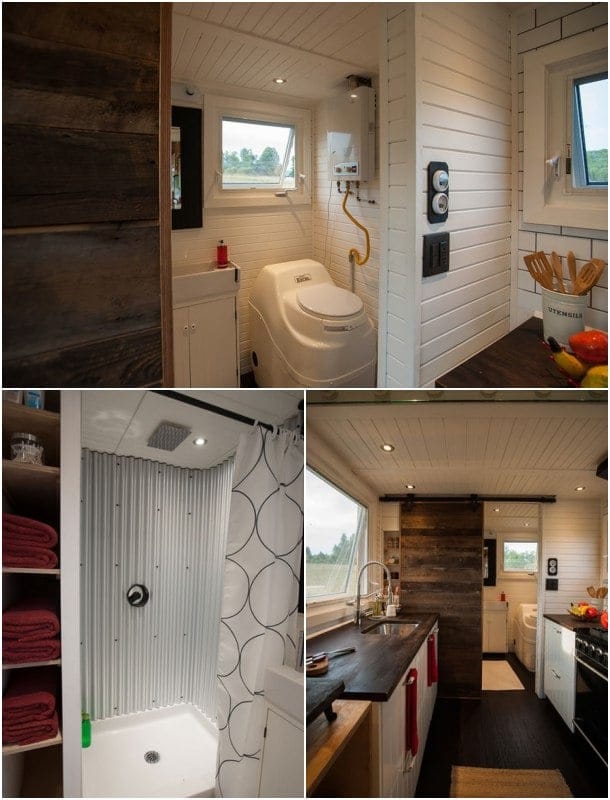 Sobre esta encantadora vivienda, hay que decir que en su equipamiento no tiene mucho sentido esas estanterías. Hay varios motivos para utilizar armarios con puertas, en vez de estantes. Uno de ellos es que los objetos no se caerán al suelo cuando la casa se mueva. Y hay otro aún más importante: el poco espacio de una tiny house se debe aprovechar para almacenamiento, y no tanto para decorar.