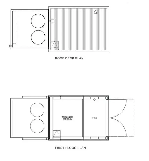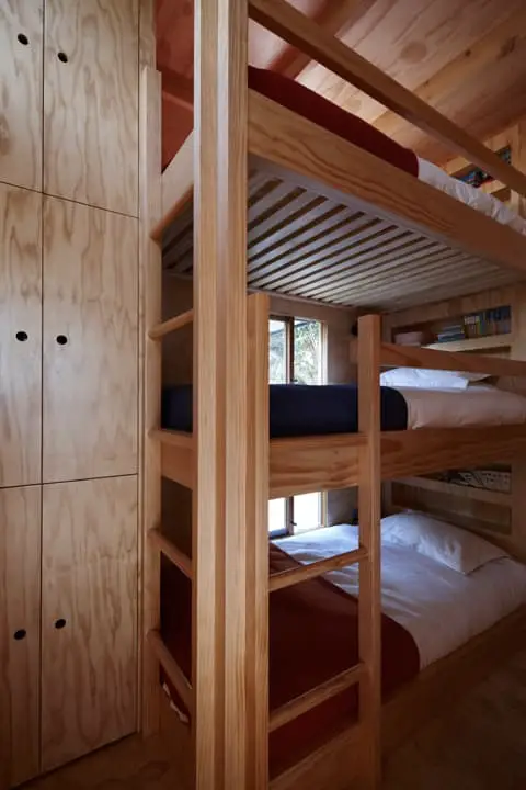 La cocina queda abierta a toda la sala, donde hay una estufa de leña. El dormitorio principal se sitúa en un altillo, al que se accede por una escalera de pared a través de una trampilla que se puede cerrar. Justo encima hay una terraza, a la que se sube por otra escalerilla. El cuarto de los niños está al fondo, dentro del volumen cúbico trasero, y está aprovechado con tres camas en litera. El cuarto de baño se sitúa entre esta habitación y el salón (ver planos).