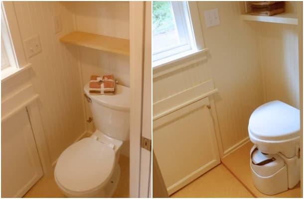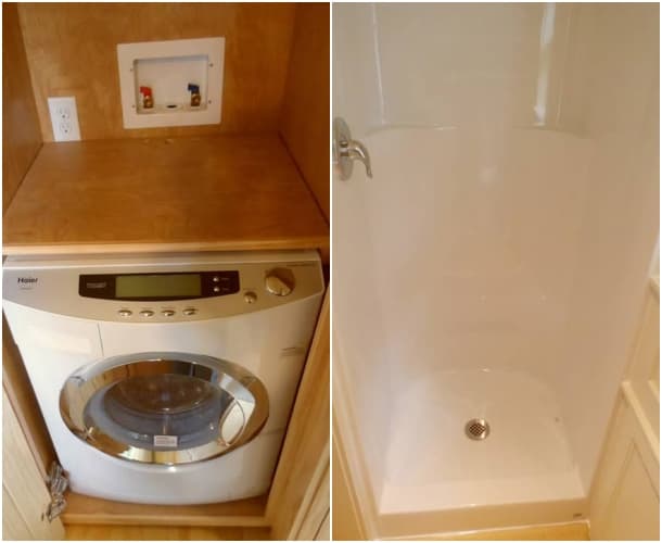 El cuarto de baño de la casa Ynez está equipado con inodoro de compostaje, pero también puede ser de cisterna, como se ve en una de las fotos. La ducha es bastante espaciosa, porque ocupa toda la anchura, alcanzando 32 pulgadas (81cm). El baño tiene extractor de aire, pero también dispone de ventana. Debajo de ella está el acceso a un pequeño trastero. (Este espacio no está disponible en todos los modelos).