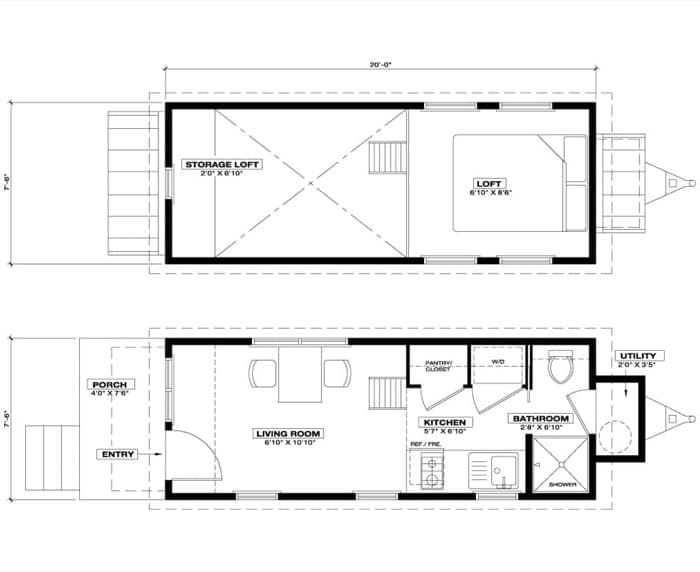 El modelo Ynez supone una evolución de Siskiyou. Surgió por petición de un cliente que deseaba una tiny house con loft más amplio, y cocina personalizada. Así que se eliminó el pequeño porche de entrada, se añadió un armario, y otro más para la lavadora. Cuando la casa está “aparcada”, en la entrada se coloca una plataforma de madera, que funciona como terraza.