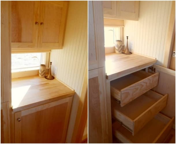 Frente a la encimera de la cocina hay dos grandes armarios. En uno se puede acomodar un horno o microondas, y debajo la lavadora/secadora. El otro armario puede servir para la ropa, aspiradora, etc. En una de las casas Ynez fabricadas, el cliente pidió una pequeña encimera con ventana, dejando armarios arriba y abajo.