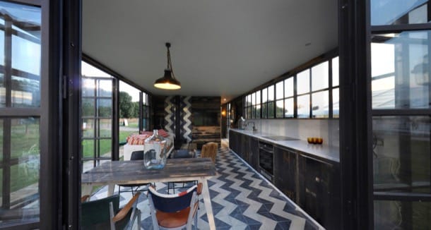 No se ve en las fotos, pero esta Big Box dispone de una cubierta ajardinada con florecillas silvestres. Eso ayuda a fomentar la biodiversidad y a mejorar el aislamiento del edificio, que está compuesto por material ecológico. Las puertas de vidrio y ventanas son de doble acristalamiento, de la firma Crittall. Esta carpintería destaca por su marco ultradelgado.