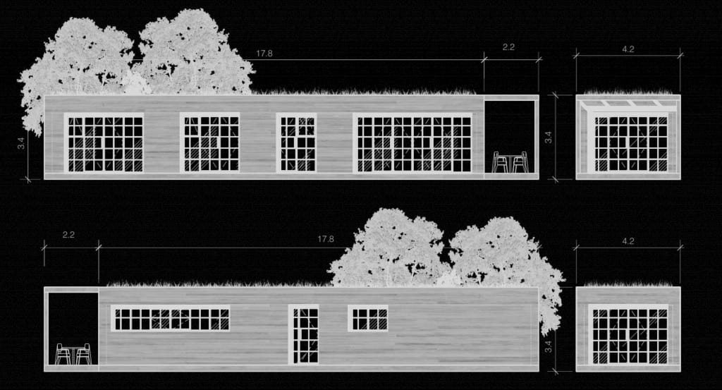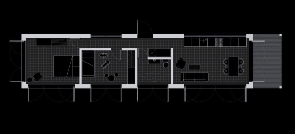 Las dimensiones exteriores son de 4,2 x 20 metros, incluyendo la terraza del salón. La superficie útil (suelo interior que se pisa) de esta vivienda ronda los 60m2, que no está nada mal. Eso da para tener dos dormitorios, un cuarto de baño espacioso, y una sala que incluye cocina y comedor.