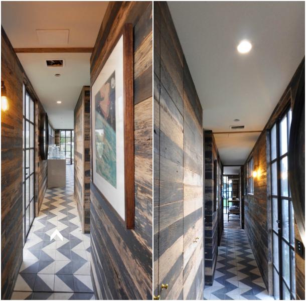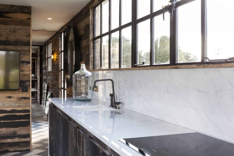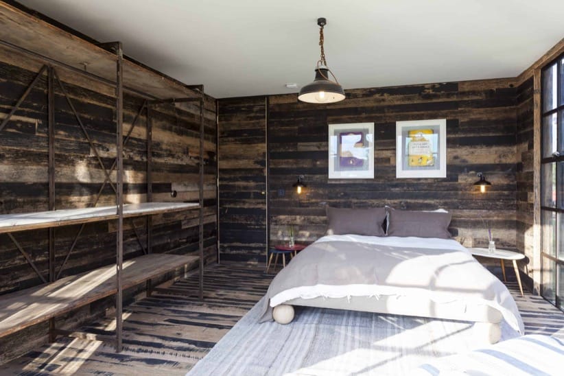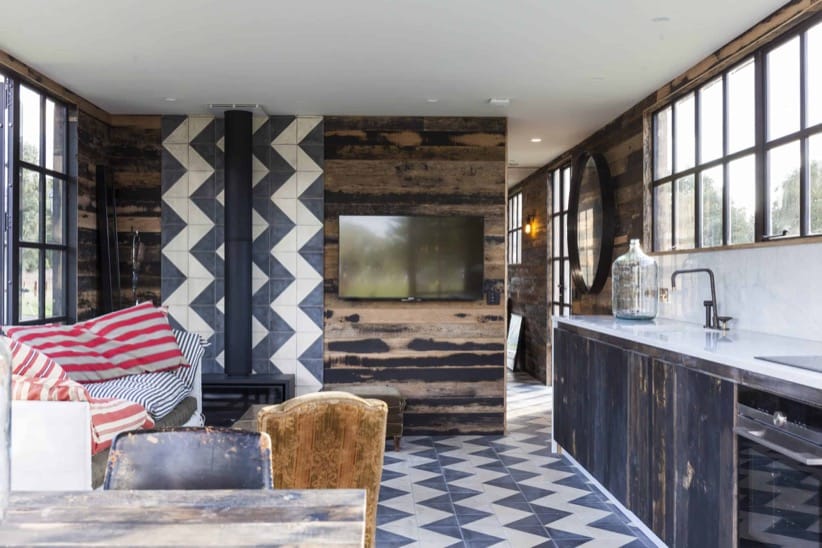 La estructura de Big Box está formada por paneles con aislamiento incorporado, más conocidos como paneles SIPs. Se utiliza madera recuperada para el revestimiento interior y exterior de los muros. Eso aporta un ambiente rústico que a determinadas personas puede parecer excesivamente recargado1. Para el cuarto de baño se emplea un revestimiento de azulejo hecho a mano 2(el mismo que aparece en el salón). Va acompañado con grifería de latón de la marca Watermark. La cocina combina superficies de madera, con piedra pulida (mármol blanco), pero con la peculiaridad de que no tiene armarios superiores. En vez de eso se optó por colocar una gran ventana horizontal. Esta configuración es bastante discutible, puesto que la vivienda ya cuenta con suficiente luz natural. Hubiera sido más práctico sacrificar esa ventana (o gran parte de ella), y dotar a la casa de mayor espacio de almacenamiento. Algo parecido ocurre con el cuarto de baño, que tiene acristalada toda la fachada de la ducha, comprometiendo bastante la privacidad.