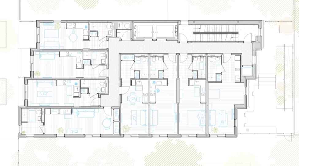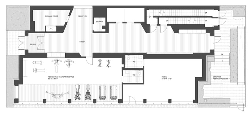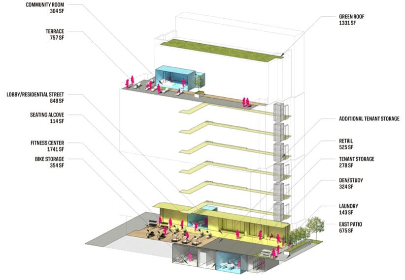 Aunque los estudios están destinados a inquilinos con salarios bajos, el edificio dispone de equipamiento asociado a apartamentos de lujo. El inmueble cuenta con unas instalaciones comunes en la planta baja y sótano (gimnasio, sala de estar, estudio, sala de la comunidad, parking de bicis). Además hay una azotea comunitaria, con otra sala, jardín y trasteros.