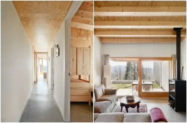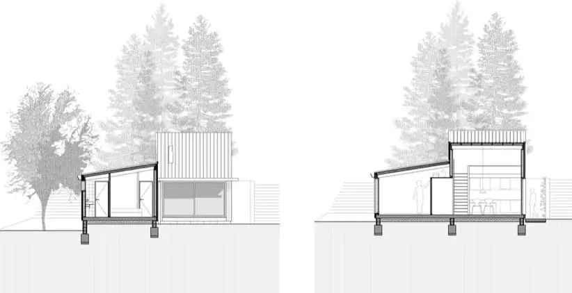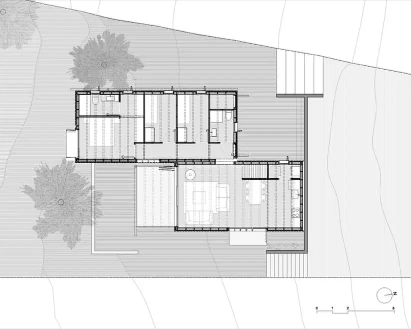 En los planos del proyecto Cottage se distinguen perfectamente dos volúmenes. Hay uno para los dormitorios, y otro para la zona de día. Los dormitorios se organizan mediante un pasillo: la habitación principal está al fondo, y tiene baño. Hay dos habitaciones más pequeñas que comparten un cuarto de baño con ducha. El cuarto de instalaciones está en una esquina, y es accesible desde el exterior.