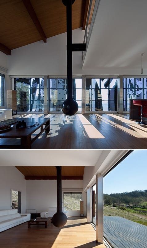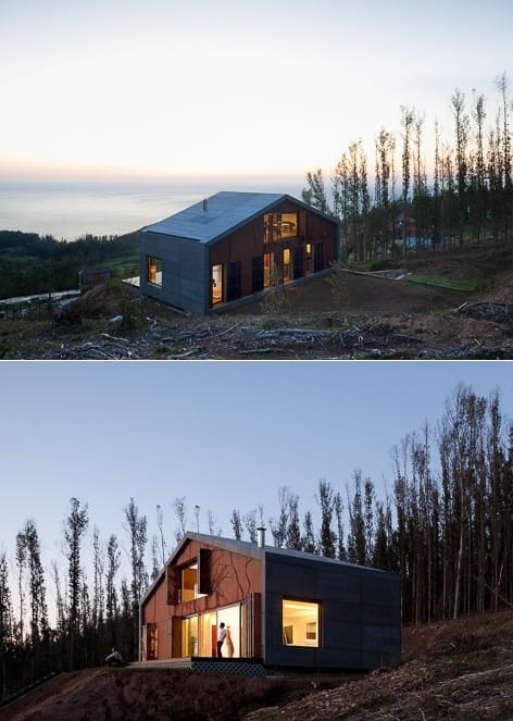 HK es una vivienda de vacaciones fabricada en Madrid (en 3 meses), y luego montada en tres días en Cedeira (Galicia), a 598km. Se trata de una sencilla propuesta de un único volumen, con cubierta a dos aguas. El edificio se ubicó en una ladera cercana al mar, y está rodeado de un bosque de eucaliptos. Los dos materiales con los que se reviste el exterior dialogan con este entorno. Cubierta y fachadas laterales son de Viroc® (prefabricado de cemento y virutas de madera). Las fachadas frontales lo hacen con paneles perforados de acero Corten. Ese proceso crea un hermoso dibujo de siluetas de árboles en fachada.