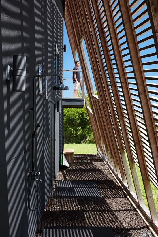 Una de las características principales de la Kauhikoa Core House es su capacidad para combinar la vida interior y exterior. La casa cuenta con 93 metros cuadrados de espacio exterior cubierto, incluyendo una gran lanai que sirve como sala de estar al aire libre. La pantalla modular de teca, fabricada en Bali, filtra los vientos fuertes y el sol de la mañana. Además proporciona espacio para guardar tablas de surf, bicicletas, equipo de playa, y una ducha exterior.