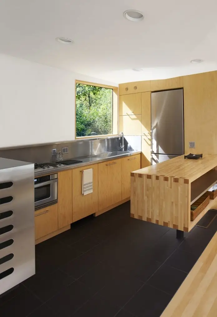 La innovación y sostenibilidad son pilares fundamentales en el diseño de KOBY. La estructura de acero del edificio, revestida con madera de cedro certificada, no solo garantiza durabilidad sino que también se integra armoniosamente con el entorno natural. Los suelos de la cocina y baños, hechos de baldosas con material reciclado, reflejan el compromiso con el medio ambiente.