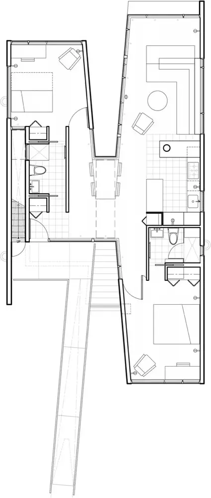 El comedor, con su mesa de madera en voladizo, se sitúa en el corazón de la casa. Está diseñado como un espacio terapéutico que invita a la unión familiar. La luz natural inunda el interior, creando un ambiente cálido y acogedor que se extiende a los dos dormitorios. Dichas habitaciones están diseñadas para ofrecer confort y privacidad.