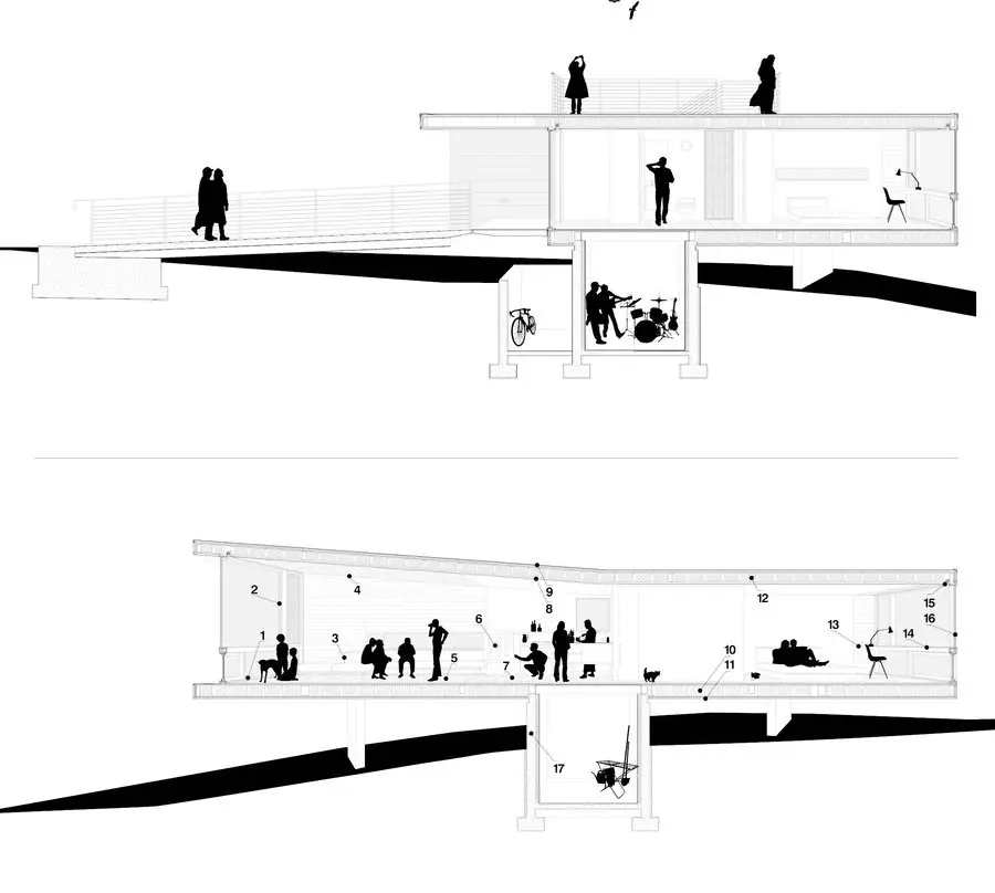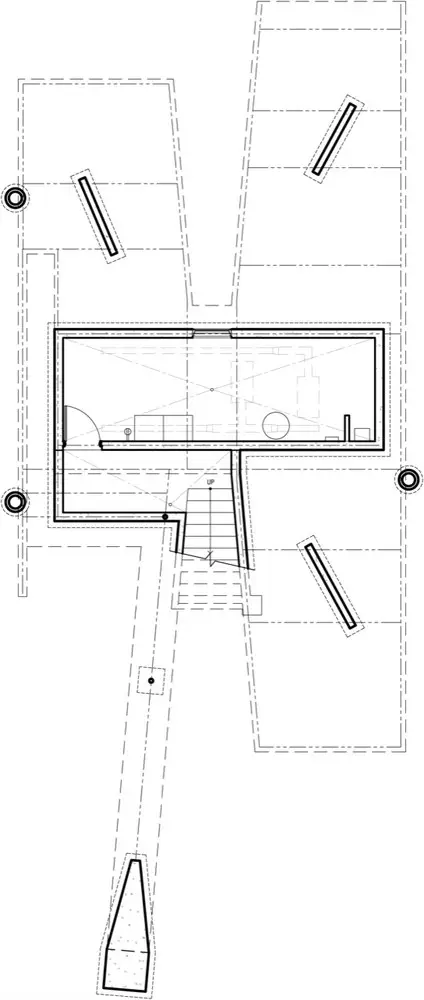 El exterior está revestido con planchas metálicas, y hay una rampa de suave pendiente. Se integra perfectamente en el paisaje, respetando la belleza natural del entorno. La cubierta practicable, accesible mediante escaleras laterales, ofrece un espacio adicional para disfrutar de vistas sin igual. Las instalaciones situadas en un espacio inferior garantizan que todas las necesidades de los residentes estén cubiertas.