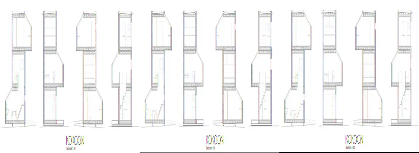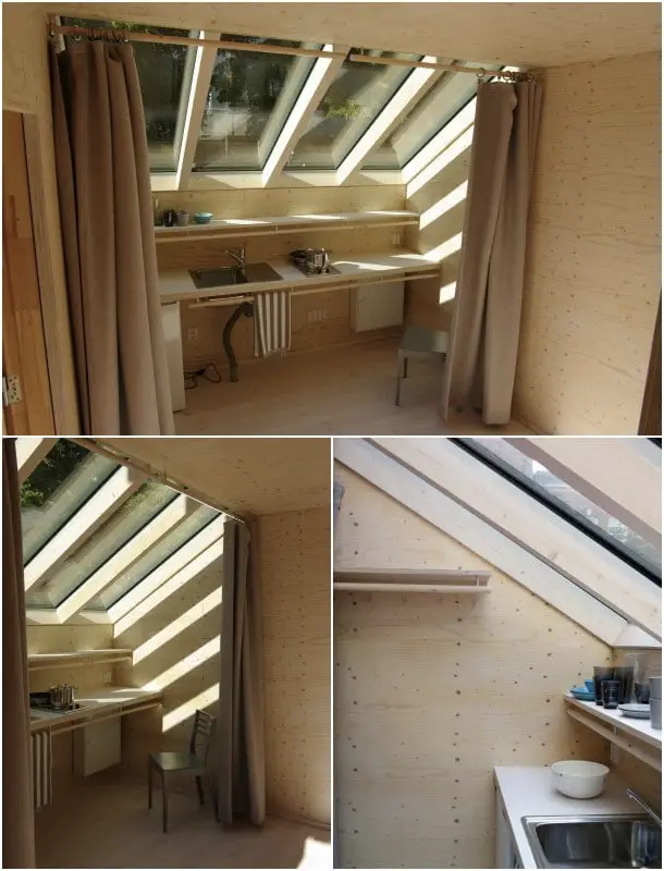 Estas imágenes corresponden al primer prototipo creado, utilizando tres módulos Kokoon. Es una disposición que proporciona una pequeña vivienda de 35m2, con espacios interiores bien iluminados, gracias al lucernario inclinado de cada módulo. El montaje de esta unidad solo requirió de un día de trabajo.