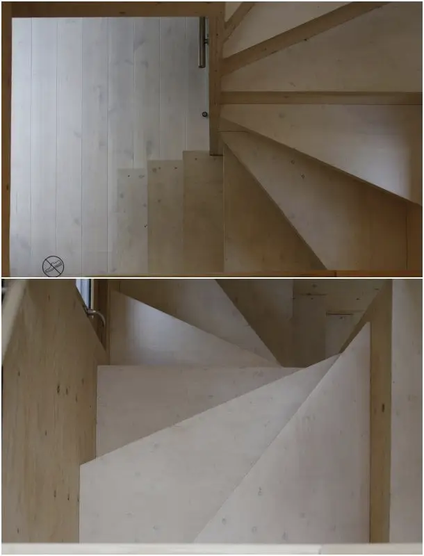 Cada módulo se construyó en taller, empleando madera laminada y panel de abeto. El aislamiento se hizo con fibra de madera proyectada. Y todo el interior, incluidos muebles, se dejaron sin tratar.