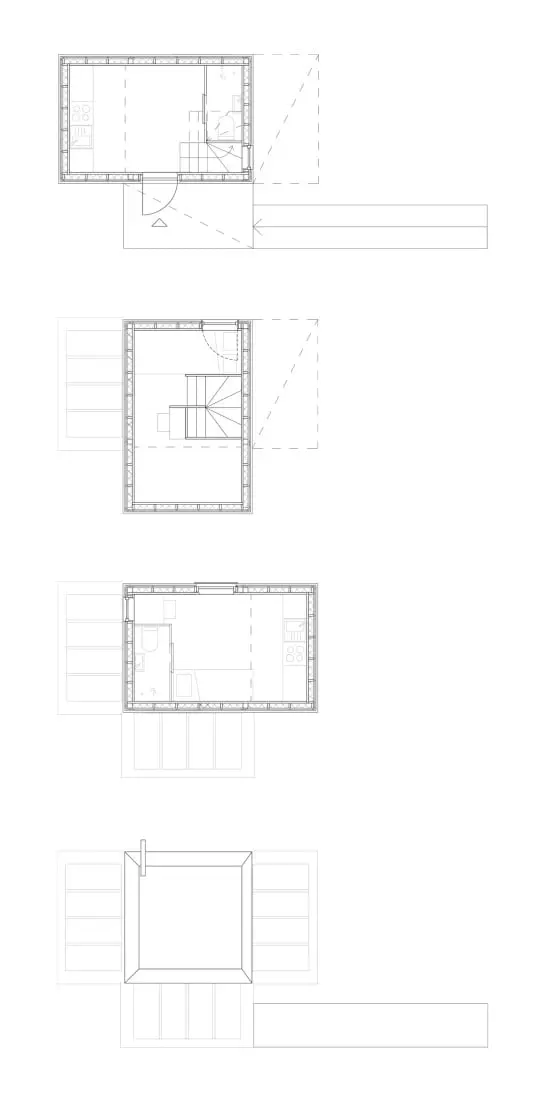 Este ejemplo de tres módulos aporta a sus ocupantes de espacio para cocina-comedor, cuarto de baño, dormitorio, estudio, y sitio para almacenamiento. El acceso a los niveles superiores se realiza mediante una escalera interior de madera.