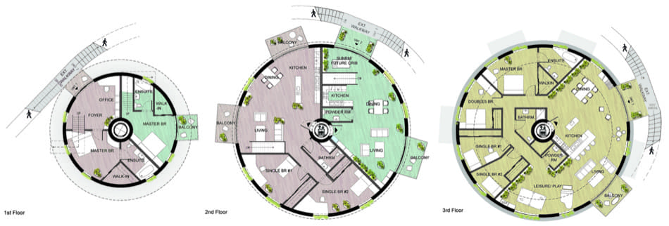 Una escalera exterior sube a cada nivel, pues dentro se pueden distribuir tres viviendas. Así se explica en los planos de planta y sección. Hay una vivienda en el piso superior, y dos apartamentos dúplex en los niveles inferiores. Un ascensor recorre el eje de la esfera y da acceso directo al interior de cada casa. La última planta, por tener menor altura libre, está destinada a cuartos de instalaciones.