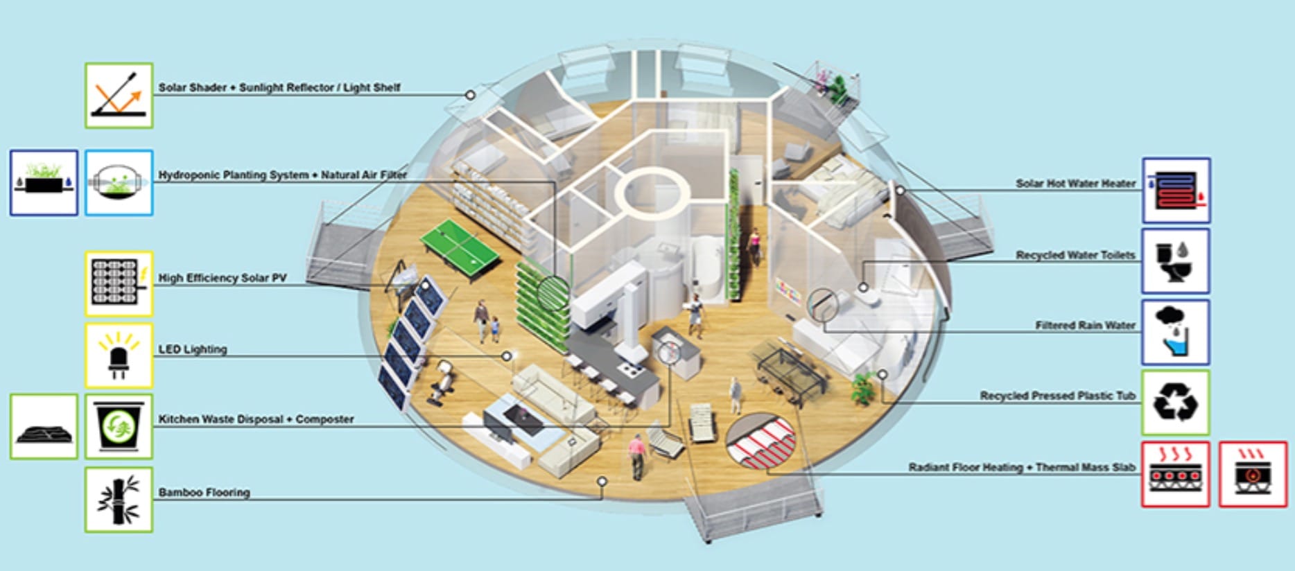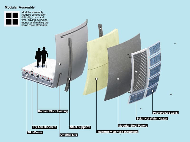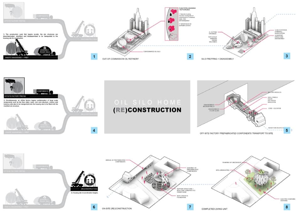 Es importante tener en cuenta que este proyecto no pretende que la gente viva donde antes existía una refinería. Los silos primero son limpiados y descontaminados, para luego desmontarlos y trasladarlos en trozos a un lugar residencial. Es evidente que esta idea tiene unas ventajas muy atractivas. Y es que estos depósitos esféricos ante todo son unas estructuras estables, e impermeables. Son por tanto válidos para adaptar en ellos una producción de arquitectura prefabricada. Además, su forma facilita la captación de energía solar.