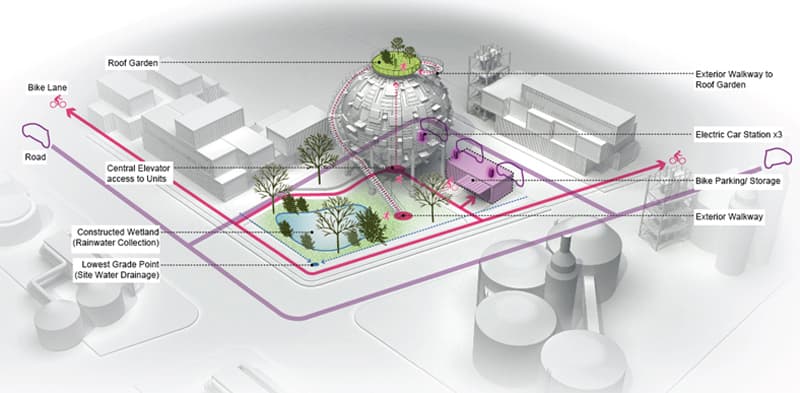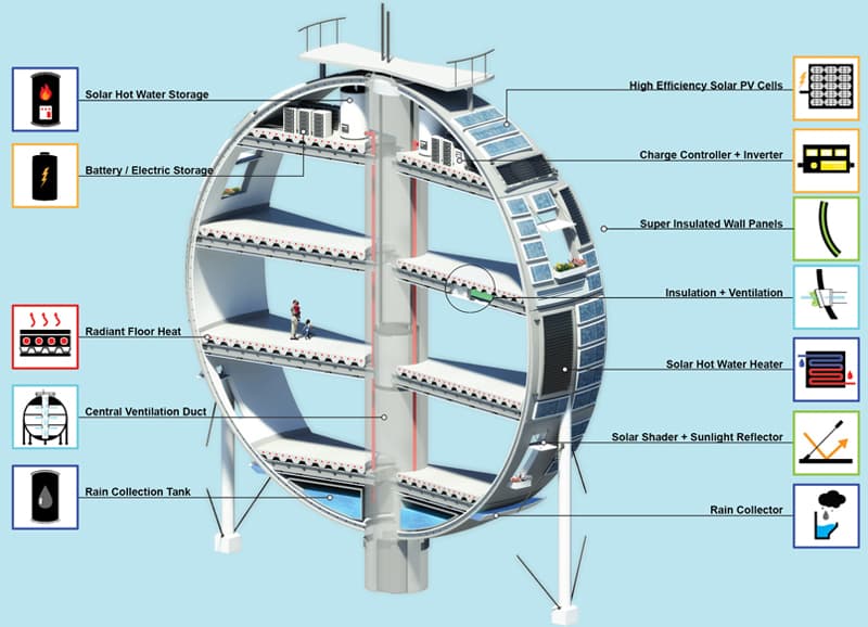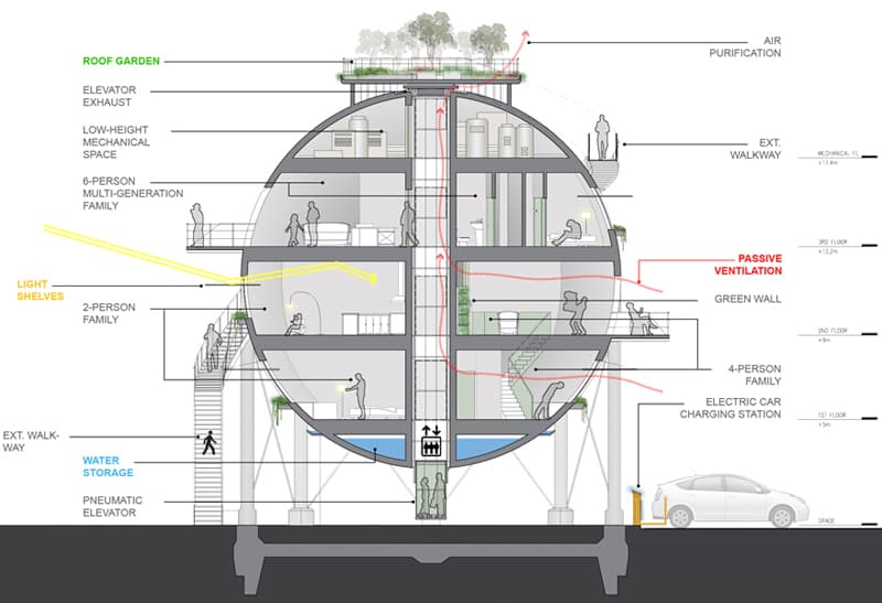 Este proyecto de viviendas plurifamiliares en silo plantea la producción en serie con elementos prefabricados. Pero para hacerlo aún más sostenible, se le incorporó un sistema de captación por energía solar en su fachada esférica.