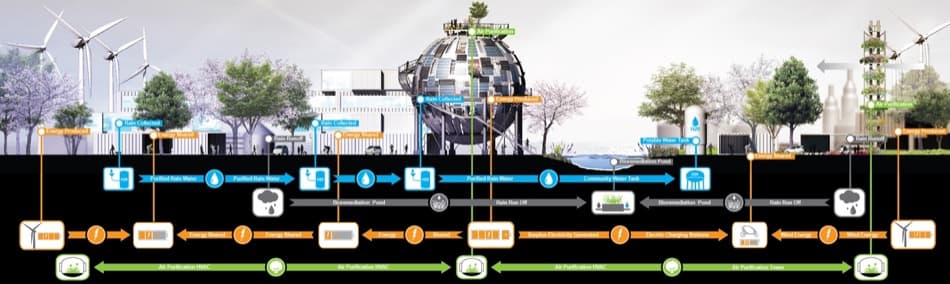 Hay que tener presente que este concepto va incluso más allá de la reutilización de los silos en viviendas asequibles y sostenibles. Estas comunidades estarían interconectadas con la infraestructura de recursos compartidos. Es decir, que tanto la electricidad producida por las turbinas eólicas, como el excedente de los paneles fotovoltaicos, es energía transferible a la red eléctrica local.