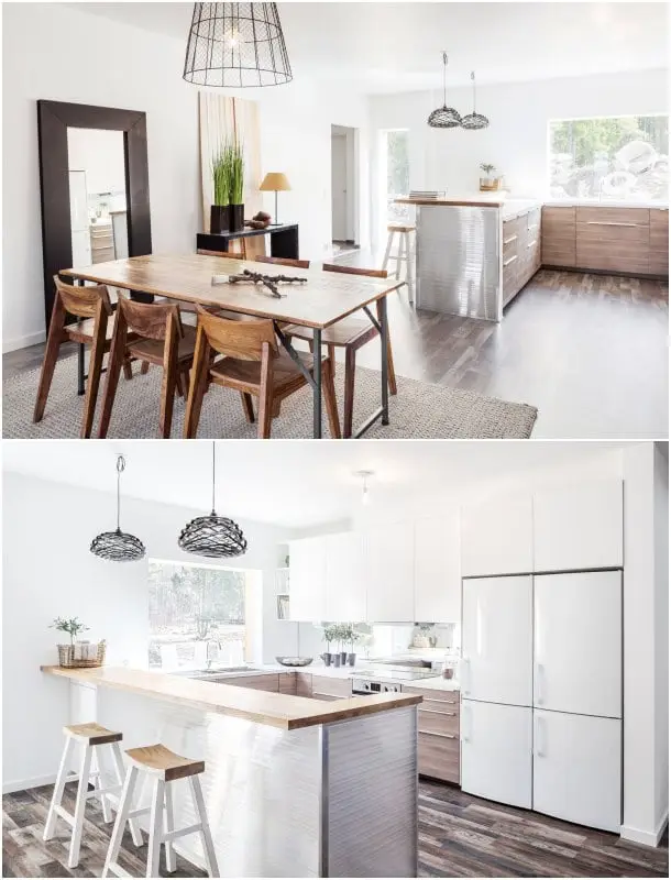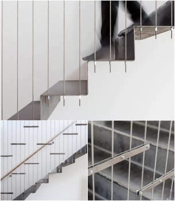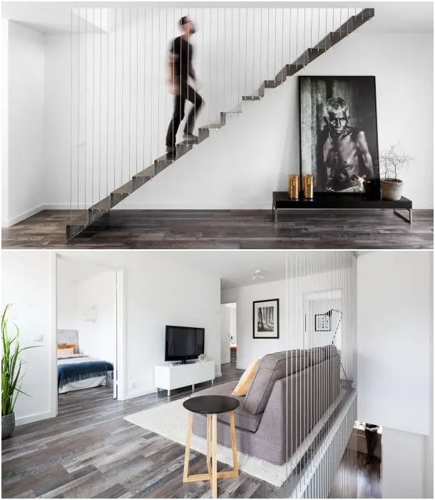 El interior refleja la sencillez de su fachada. Tiene suelos de madera, grandes ventanas, y ciertos acabados industriales en cocina y escalera. La escalera es una chapa metálica que está empotrada en el muro, y colgada de cables en el borde opuesto. Como se aprecia en las fotos, esa no ha sido una buena solución. Precisamente porque se tuvieron que añadir después unas placas metálicas para mantener la separación entre cables. Tampoco el remate de los cables en la parte inferior de la chapa de escalera, es el adecuado. ¿El motivo? porque podría dañar a algún niño que pasara por debajo.