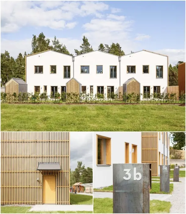 Los residentes de estas casas prefabricadas en hilera tienen una factura eléctrica que es la envidia de sus vecinos. Gracias a los paneles solares y el comportamiento solar pasivo, cada una de estas PowerHouse es considerada una vivienda de energía cero. Estas casas se construyeron en la localidad sueca de Upplands Väsby.
