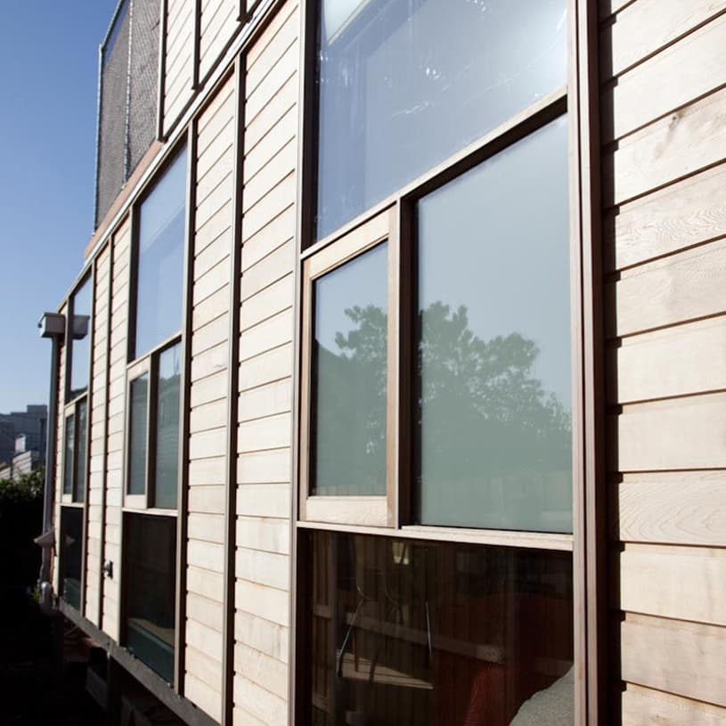 Tanto los materiales como la técnica constructiva empleada se seleccionaron para que el edificio tuviera una reducida huella de carbono, incluso durante su ciclo de vida. Toda la envolvente de la Little City está muy bien aislada. Los revestimientos son de cedro rojo (con poco desecho); se empleó madera reutilizada para la cubierta; acabados de bajo o sin COV (compuestos orgánicos volátiles); carpinterías con doble acristalamiento, y madera con certificado de sostenibilidad.