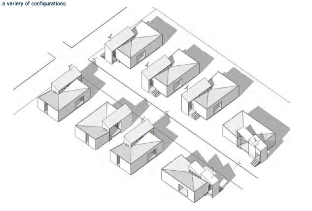 Esta casa de elementos prefabricados está elevada con respecto al suelo, según las características del lugar. La estructura del piso está hecha con marcos de madera, y podría apoyarse en un conjunto de pilotes, o sobre muros continuos.