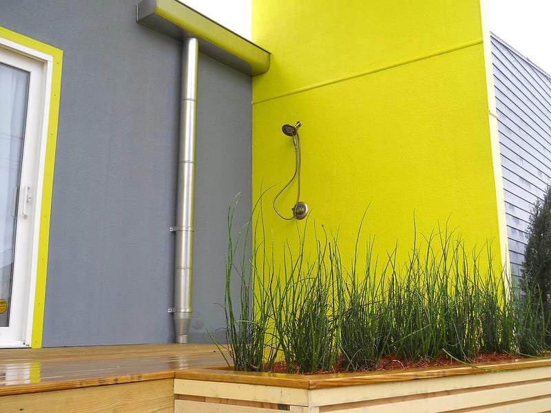 En lugar de estar construida con madera, la casa SunShower se fabrica con paneles pre-diseñados SSIPs (Steel Structural Insulated Panels). Por eso también se la conoce como SunShower SSIP House. Esos paneles son resistentes, y fáciles de perforar para crear las aberturas ovaladas del porche. También pueden funcionar como puertas correderas hacia el exterior.