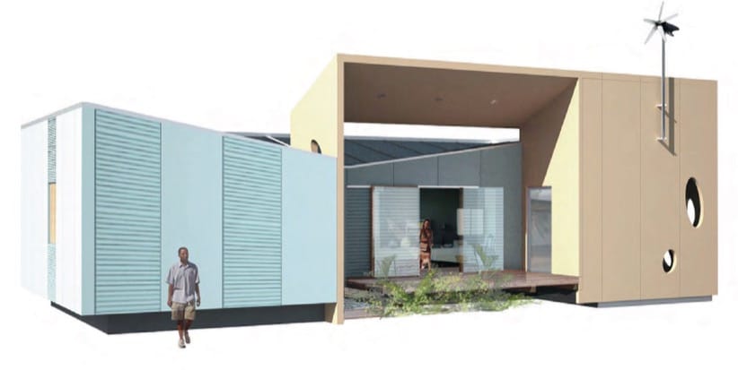 Las imágenes de este artículo corresponden a la SunShower SSIP House. Este proyecto consiguió el primer premio en un concurso de arquitectura sostenible. Se buscaba el diseño de una casa que pudiera estar desenchufada de las infraestructuras, y construirse fácilmente. Además debía ubicarse en zonas afectadas por desastres naturales o devastadas por la guerra.