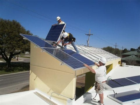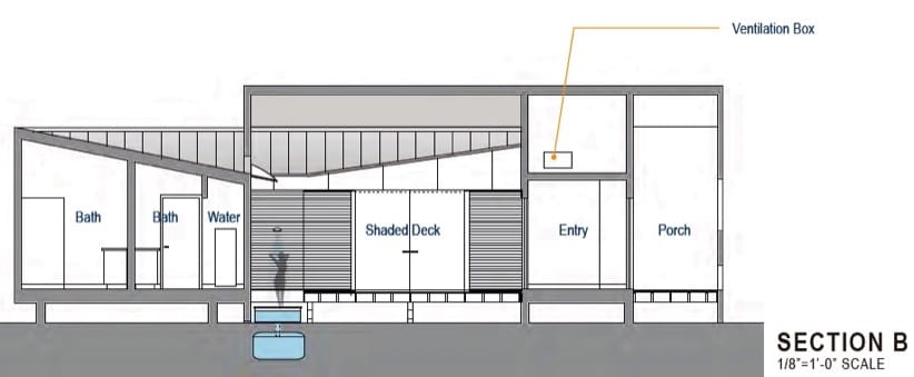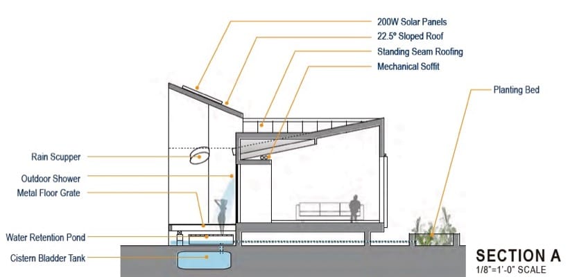 Un aspecto importante de esta vivienda tiene que ver con sus tejados. Además de aportar protección a sus ocupantes, sirven para proporcionar energía, calor, y agua. Por ese motivo hay una cubierta para una instalación de paneles solares, y otra diseñada para recoger y almacenar agua de lluvia. Ese agua se utilizaría en el lavado de ropa, riego, o en una ducha en el patio. Como era de suponer, este edificio se debe orientar adecuadamente en el sitio, con el fin de maximizar la eficiencia de sus paneles solares (fotovoltaicos y térmicos). La cubierta solar proporciona un gran porche, pues es más alta, sirviendo también para el montaje de una turbina eólica. Si fuera necesario, la pendiente de esta cubierta solar se puede invertir, para mantener una óptima exposición al sol.