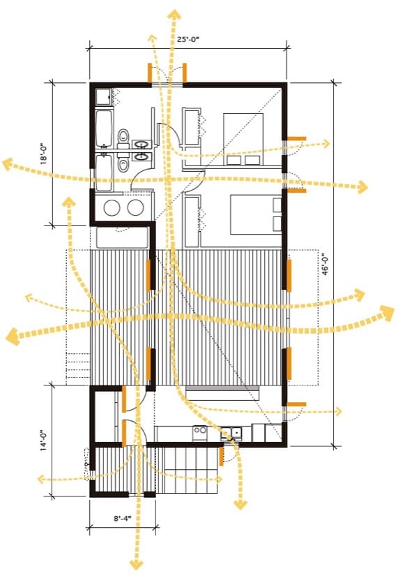 Todos los huecos de este edificio se ubicaron de tal manera que facilitan la ventilación natural cruzada. Este efecto se ve potenciado por el uso de grandes paneles deslizantes, que abren el espacio habitable hacia el exterior.