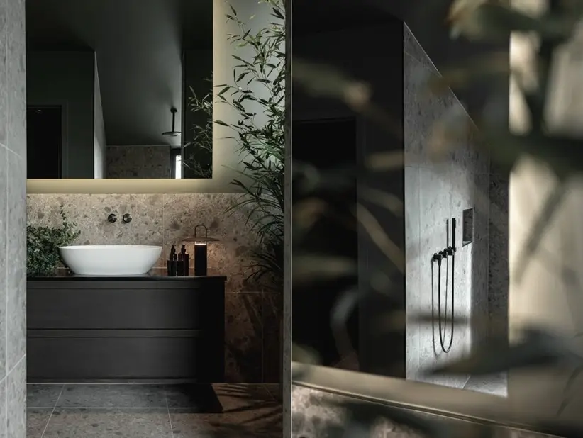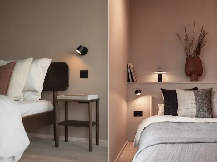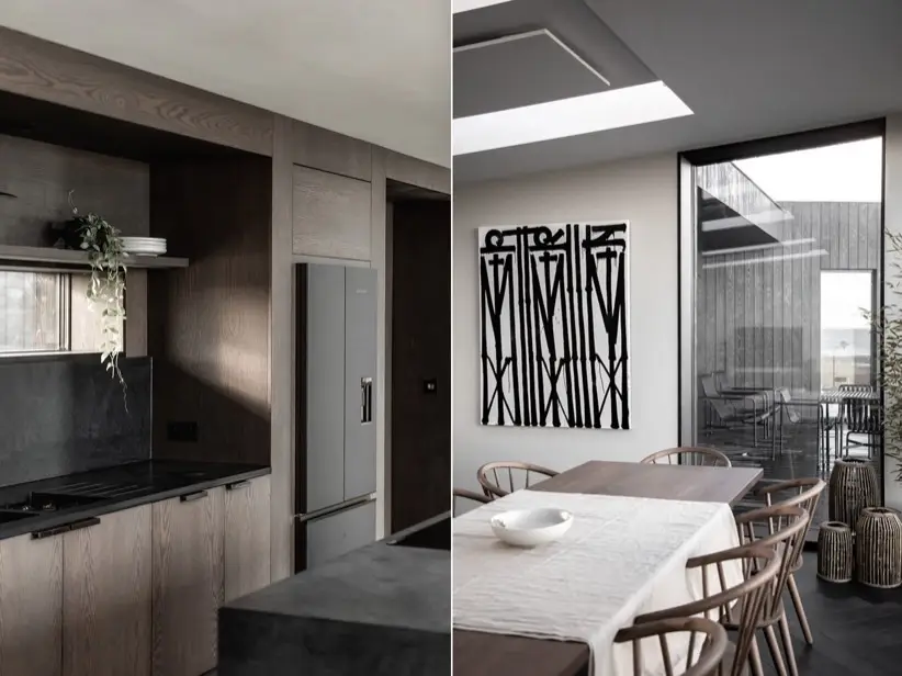 Los espacios interiores reflejan la consideración hacia la función y diseño. Se emplearon tonos terrosos, pigmentos naturales, suelos de madera, y telas naturales. Este conjunto ofrece texturas y colores suaves, que armonizan con el paisaje exterior. Con 206m2 de área interior, el diseño prioriza un espacio de vida central fluido, destinado a familiares y amigos.