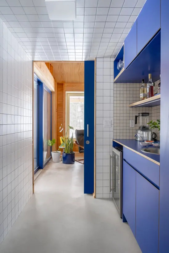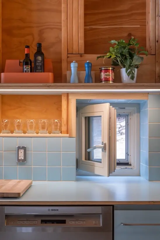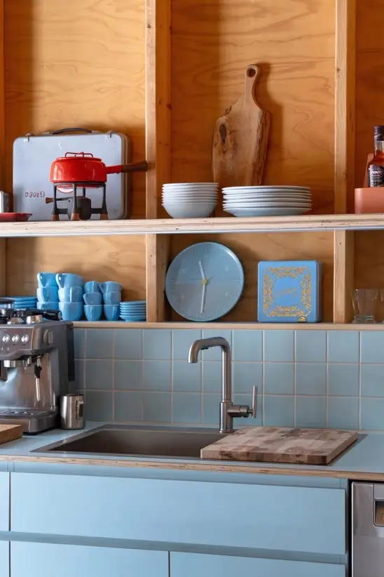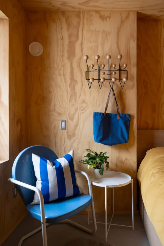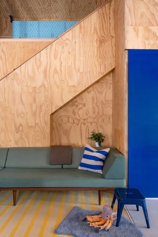 Internamente, la casa expone la madera contrachapada de abeto Douglas y la estructura de pino. Lo hace añadiendo un interés visual que contrasta con la norma de interiores acabados. La profundidad del marco de la pared se aprovecha ingeniosamente para incorporar estantes de almacenamiento en la cocina. Es un detalle inspirado en la renombrada Casa Hine de William Turnbull, Jr. en Sea Ranch.