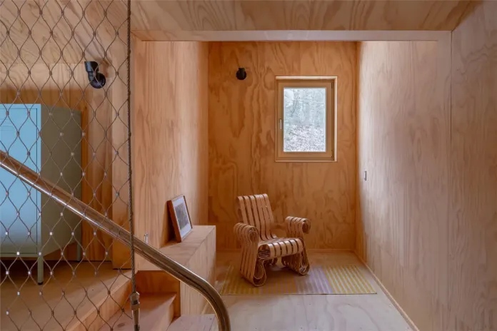 La Unfinished House presenta una restricción deliberada en el acristalamiento. Opta por una ubicación cuidadosa de las ventanas que maximiza la ventilación cruzada y la privacidad. Estas decisiones no solo mejoran la eficiencia energética sino que también fortalecen la conexión con el entorno natural, proporcionando la sensación de estar solo en un bosque.