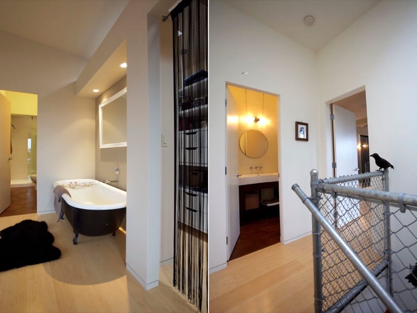 En el piso de arriba, hay un gran distribuidor que conecta con el hueco a doble altura de la sala. A un lado queda un dormitorio sencillo, con armario y balcón. En el lado opuesto se encuentra el dormitorio principal, con baño, ropero y doble balcón. La fachada principal está bastante acristalada, facilitando así la iluminación natural. En la vivienda 2×4 Zigloo se han conservado las puertas originales de los contenedores, eso aporta mayor seguridad cuando no hay nadie en casa.