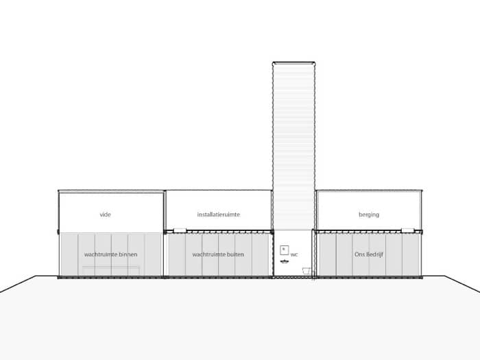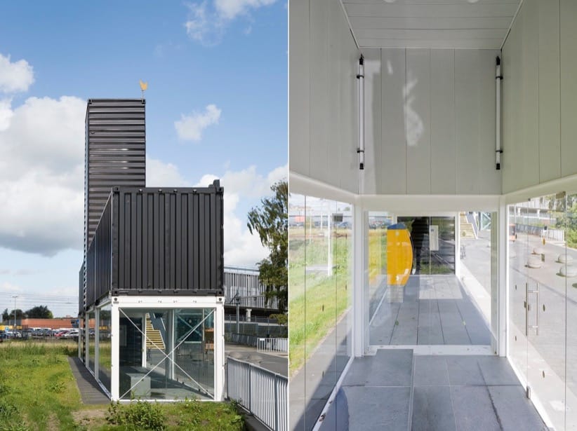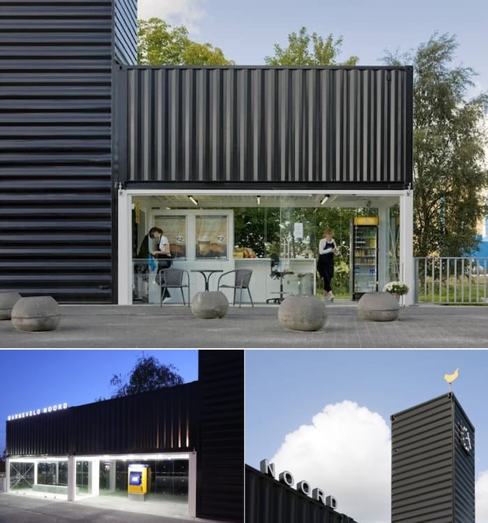 Los arquitectos usaron containers para la Estación Barneveld Norte debido a que se trataba de una instalación temporal. Como se puede apreciar en las fotografías, el edificio está compuesto por varios módulos de 20 pies. La planta baja está casi por completo acristalada, y encima hay tres contenedores suspendidos que definen el techo. Esta disposición hace que uno de los contenedores cree un espacio a doble altura en el extremo de la sala de espera. Los otros dos tienen una trampilla de acceso en su cara inferior, proporcionando un espacio extra al edificio. Uno se utiliza para alojar las instalaciones, y el otro como espacio de almacenamiento para la cafetería.