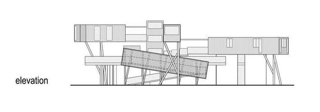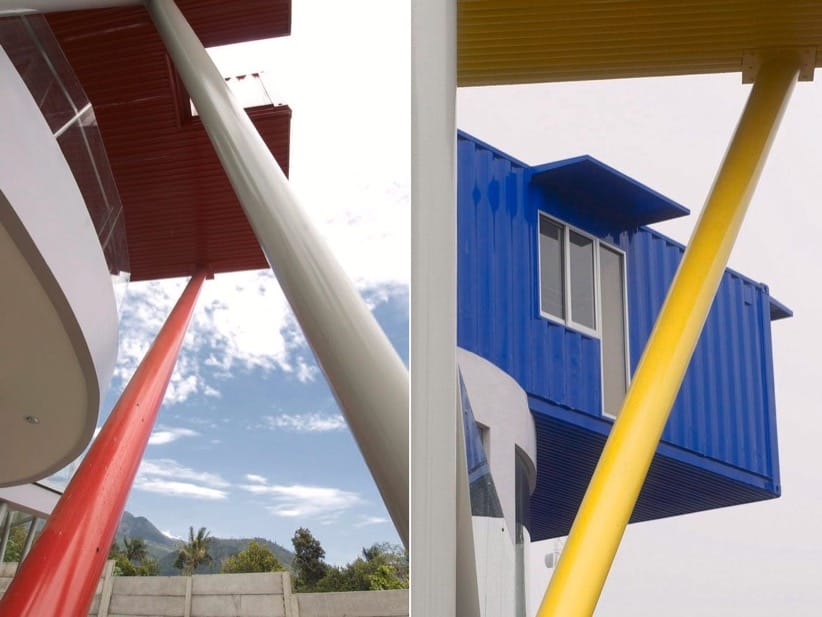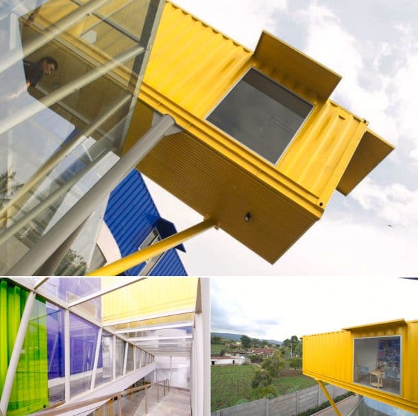 Este edificio no oculta en ningún momento a los contenedores ISO utilizados para crear determinados espacios. Aquí se sigue un procedimiento similar cuando se empleó un contenedor como oficina; o el utilizado para las casas 2×4 Zigloo. Esta vez se hace pintándolos de llamativos colores, y manteniendo su aspecto corrugado original. Pero hay quien opina que proceder de esta manera es degradar la arquitectura, y que habría que ir a soluciones más elaboradas. En este sentido, las viviendas plurifamiliares con contenedores diseñadas por Group41 podrían ser un buen referente.