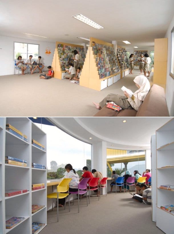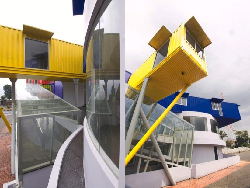 Este edificio formado por coloridos contenedores de transporte, está ubicado en Batu (este de Java, Indonesia). Es una ciudad relativamente nueva, pero que está muy arraigada en las actividades agrícolas. El proyecto es conocido por el nombre de Contertainer, que resulta de mezclar los términos “container” (contenedor) y “entertainer” (entretenimiento). Es importante aclarar que en este medio rural la palabra “entretener” tiene un significado más auténtico. Según explican sus autores es “proporcionar una verdadera diversión a gente de clase baja, a gente humilde”. Estas instalaciones simplemente ofrecen un servicio de atención médica, y acceso a lecturas de calidad.