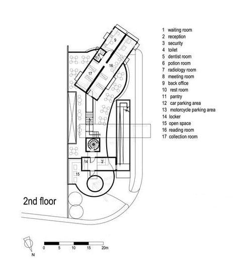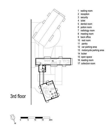 Los contenedores solamente ocupan las plantas superiores, y están dispuestos en voladizo. En el piso intermedio se han utilizado módulos container para archivo, oficinas, y sala de lectura. La última planta se ha hecho íntegramente juntando contenedores. Por un lado hay una sala de lectura rectangular, y atravesando una galería se llega a otra más cuadrada.