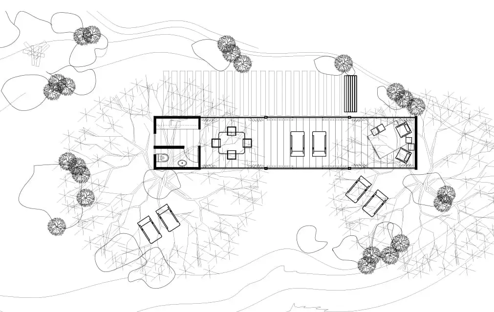 Se ha mantenido la estructura original del contenedor, pero se pintó de un color oscuro el exterior. Este detalle hace que la oficina se integre mejor en el paisaje natural. En el interior se ha creado un espacio diáfano que incluye una zona de espera, y una mesa de reuniones. En un extremo se ha dispuesto un aseo, garantizando que todas las necesidades de una oficina de ventas estuvieran cubiertas.