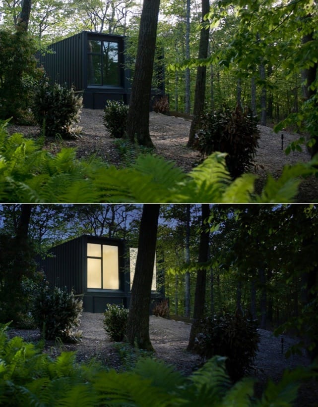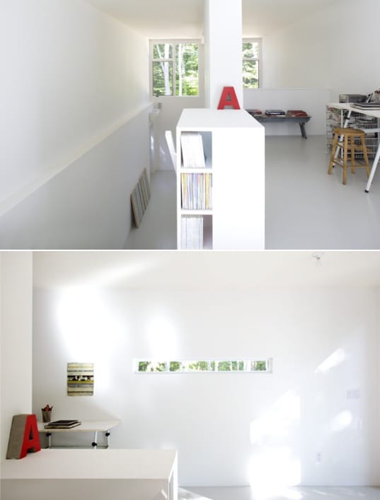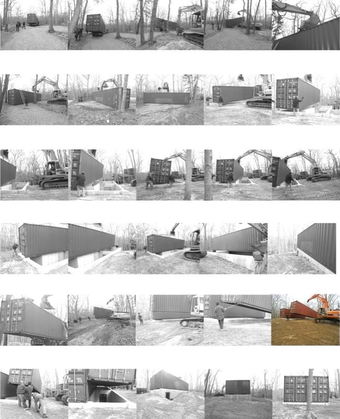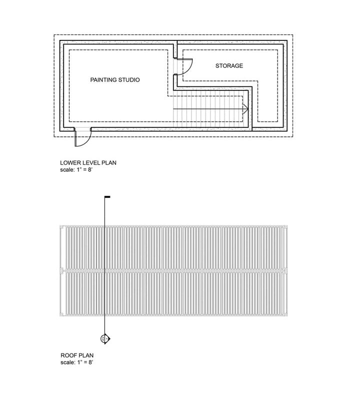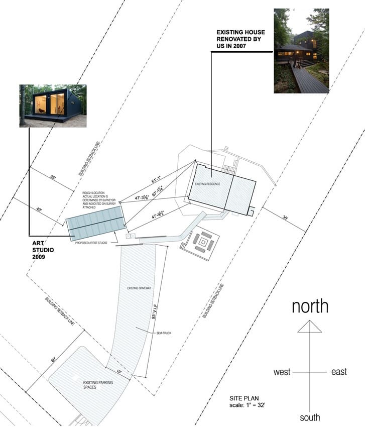 Como el propietario deseaba que el nuevo taller de pintura estuviera cerca de su vivienda, mandó construirlo dentro del jardín. Hay que decir que la finca se ubica en Amagansett, formando parte del condado Suffolk de Nueva York. Un aspecto interesante del proyecto es que se aprovechó la pendiente del terreno para crear un edificio de dos plantas. Esta particularidad permitió que el estudio para este pintor tuviera un semisótano, delimitado por muros de hormigón armado. Sobre esos muros se colocaron entonces los dos contenedores marítimos, que costaron $2.500 cada uno.