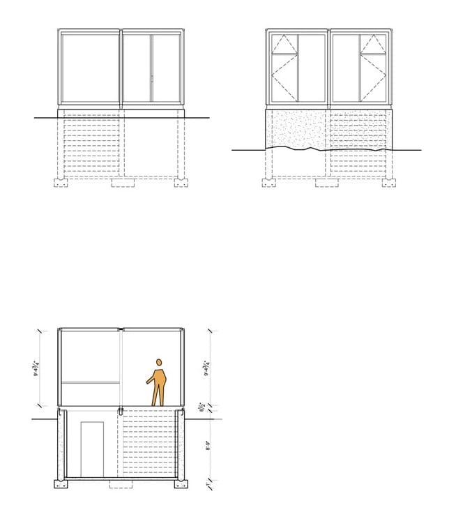 Los contenedores se pintaron de gris oscuro, y por ambos extremos se le abrieron grandes ventanas. Los dibujos y planos explican muy bien la composición de este proyecto.