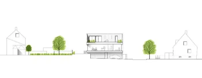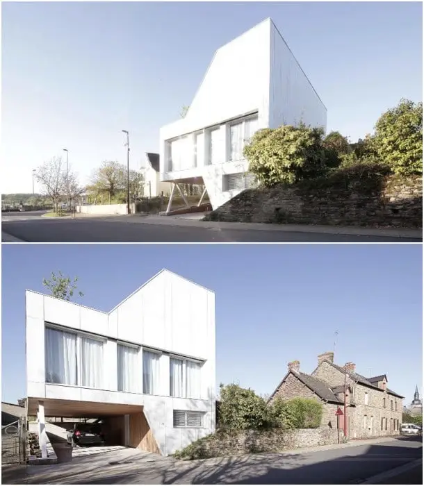 El reto era enorme en este proyecto. Los clientes tenían un bajo presupuesto, y mucha prisa para tener su casa. Para hacerlo aún más difícil, la parcela no era muy grande (150m2), ubicada en un pueblo próximo a Reenes (Francia). Además, en el terreno había un desnivel de 1,5m, y el programa tenía que incluir tres dormitorios. Los arquitectos resolvieron este puzzle con una vivienda container llamada Flying Box.